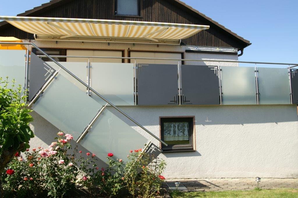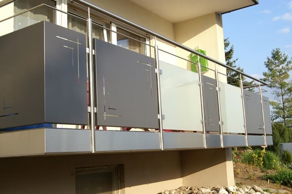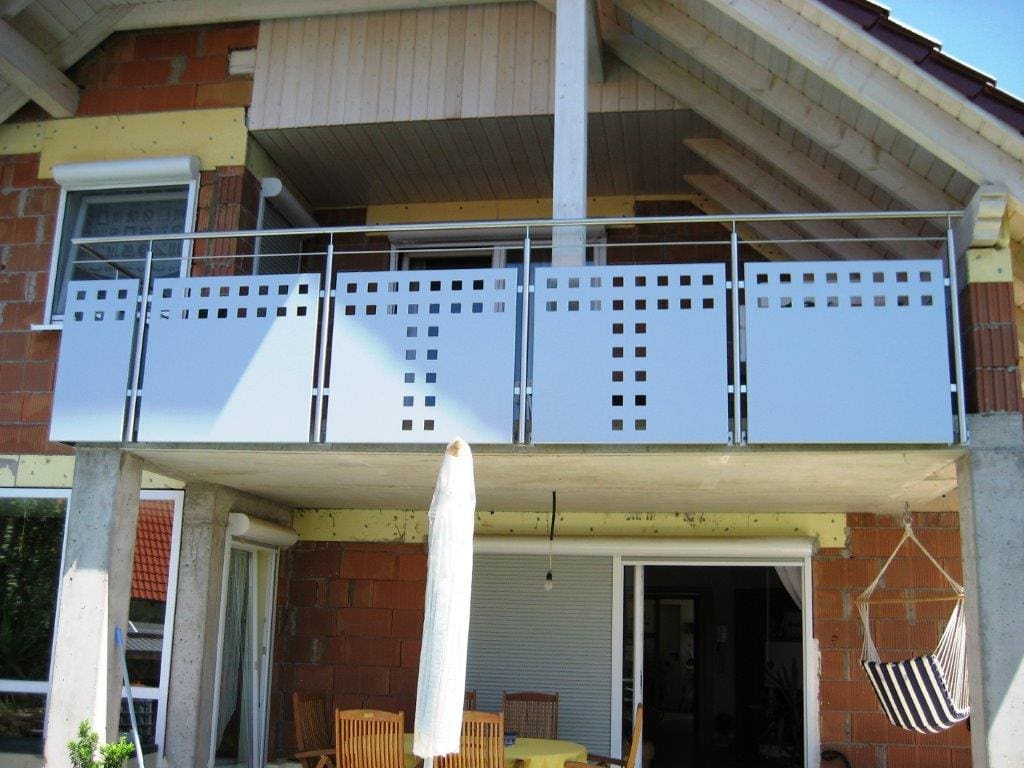 Vor allem Balkongeländer sollen meist weitere Funktionen wie einen Sicht- und Windschutz erfüllen. Wir setzen hierbei auf den zeitgemäßen Werkstoff Edelstahl in Kombination mit verschiedensten Geländerfüllungen. Ob klares, satiniertes oder bedrucktes Glas, beschichtete Aluminiumlochbleche nach Kundenwunsch gestaltet oder edle Geländerfüllungen aus Edelstahlbelch – unsere Produktvielfalt ermöglicht Ihnen eine große Gestaltungsfreiheit bei der Wahl Ihres Wunschgeländers.